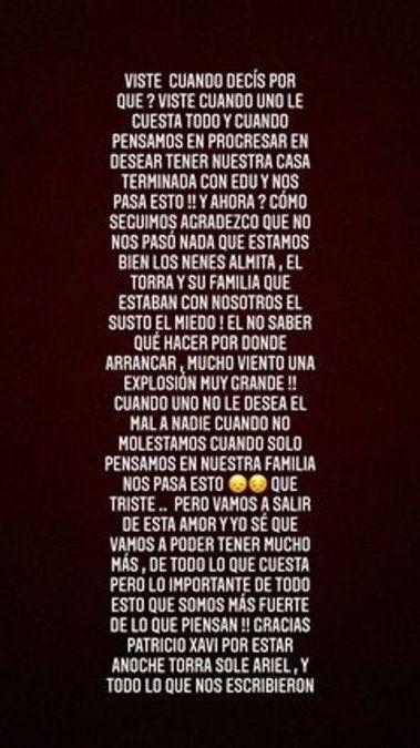 "Viste cuando decís ¿por qué? Viste cuando a uno le cuesta todo y cuando pensamos en progresar, en desear tener nuestra casa terminada con Edu y nos pasa esto!!! Y ahora qué, cómo seguimos?", continuó Quiroz.