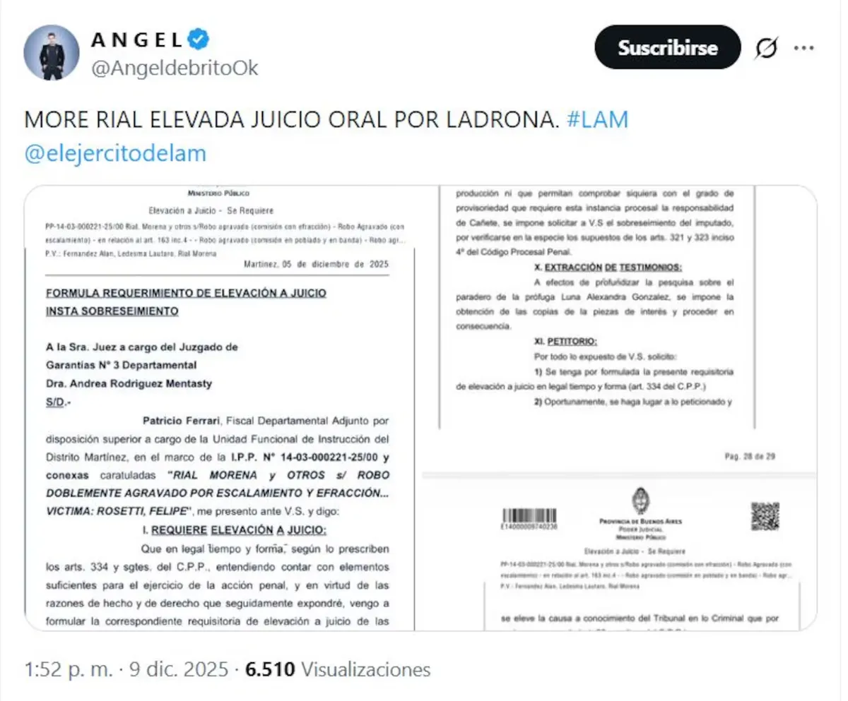 Fue Ángel de Brito quien reveló la noticia a través de cuenta de X junto al documento oficial del requerimiento. “Morena Rial elevada a juicio oral por ladrona”, escribió el conductor.