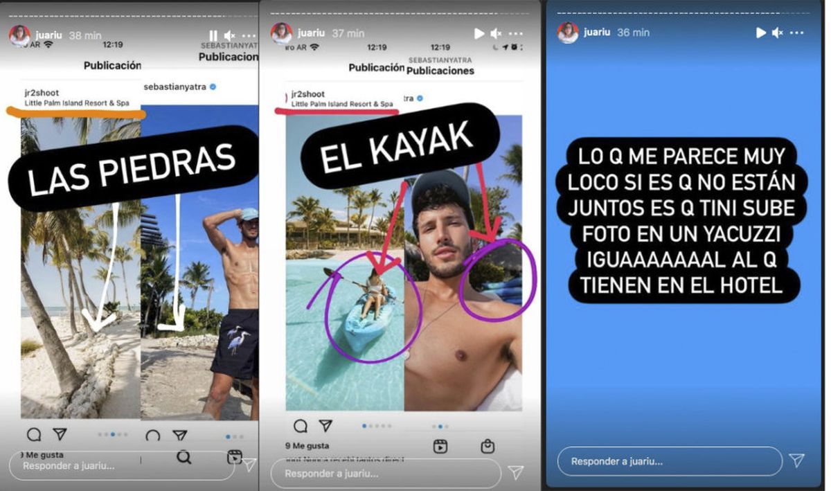 Analizando y comparando sus respectivos posteos, Juariu descubrió a Tini en el jacuzzi de ese mismo hotel. Además ambos subieron fotos de cerca tratando de que no se vea el mismo escenario de fondo.