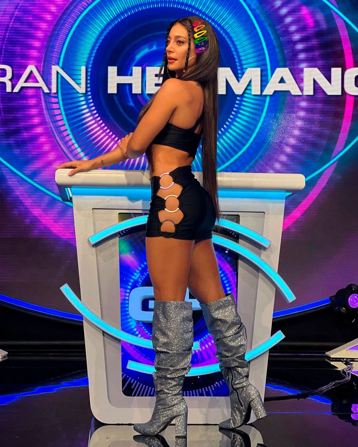 Pérez lució un vestido negro y con botas altas de color plateado y brillantes. Para su peinado presentó extensiones y unas trabas de distintos colores representando la bandera del orgullo LGBT.