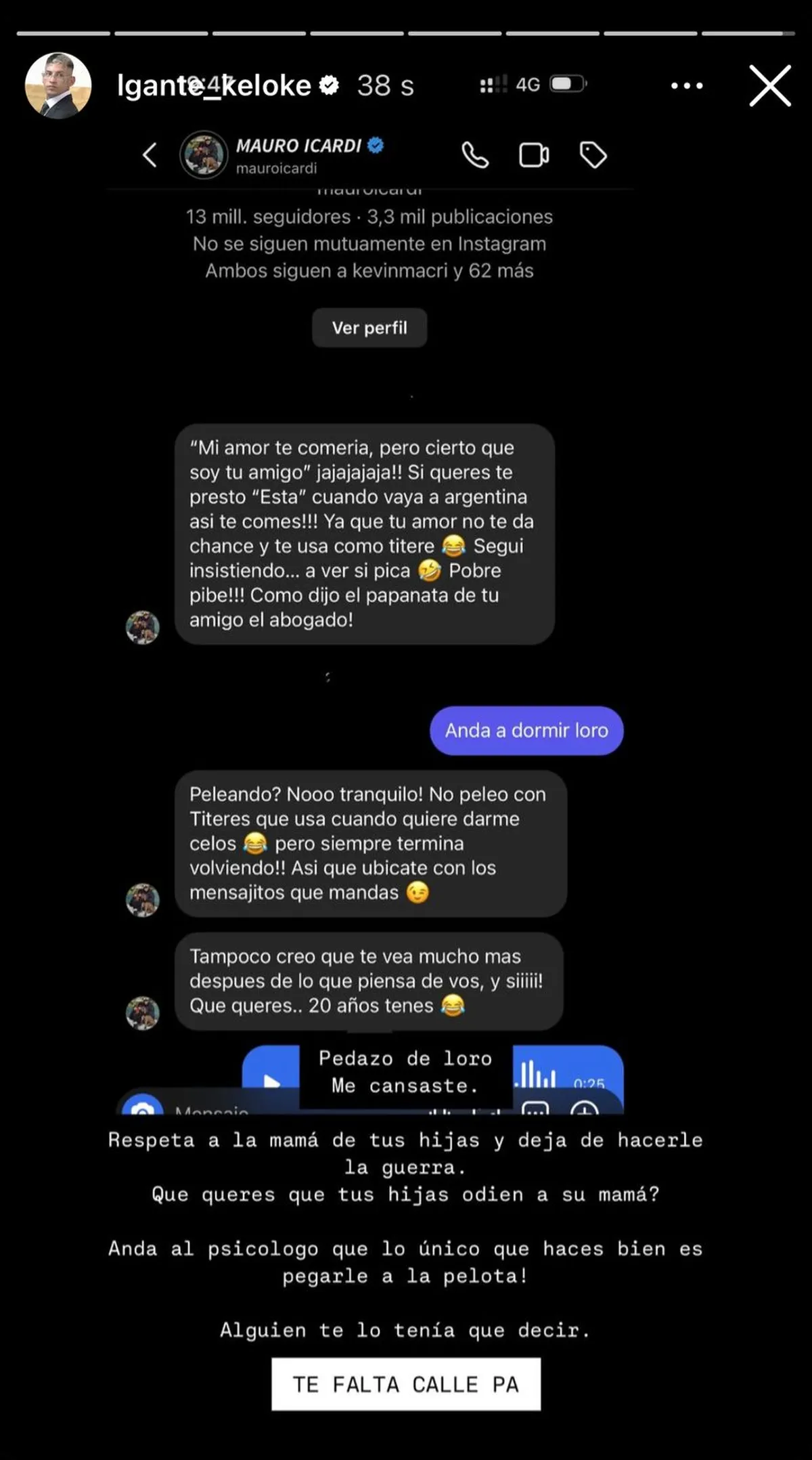 En LAM mostraron los mensajes que L-Gante le mandó a Mauro Icardi pidíéndole que dejé de agredir a Wanda Nara. "Pedazo de loro me cansaste. Respeta a la mamá de tus hijas y deja de hacerle la guerra. ¿Qué querés, que tus hijas odien a su mamá? Anda al psicólogo que lo único que haces bien es pegarle a la pelota. Alguien te lo tenía que decir. Te falta calle pa”, disparó el cantante en su historia de Instagram.