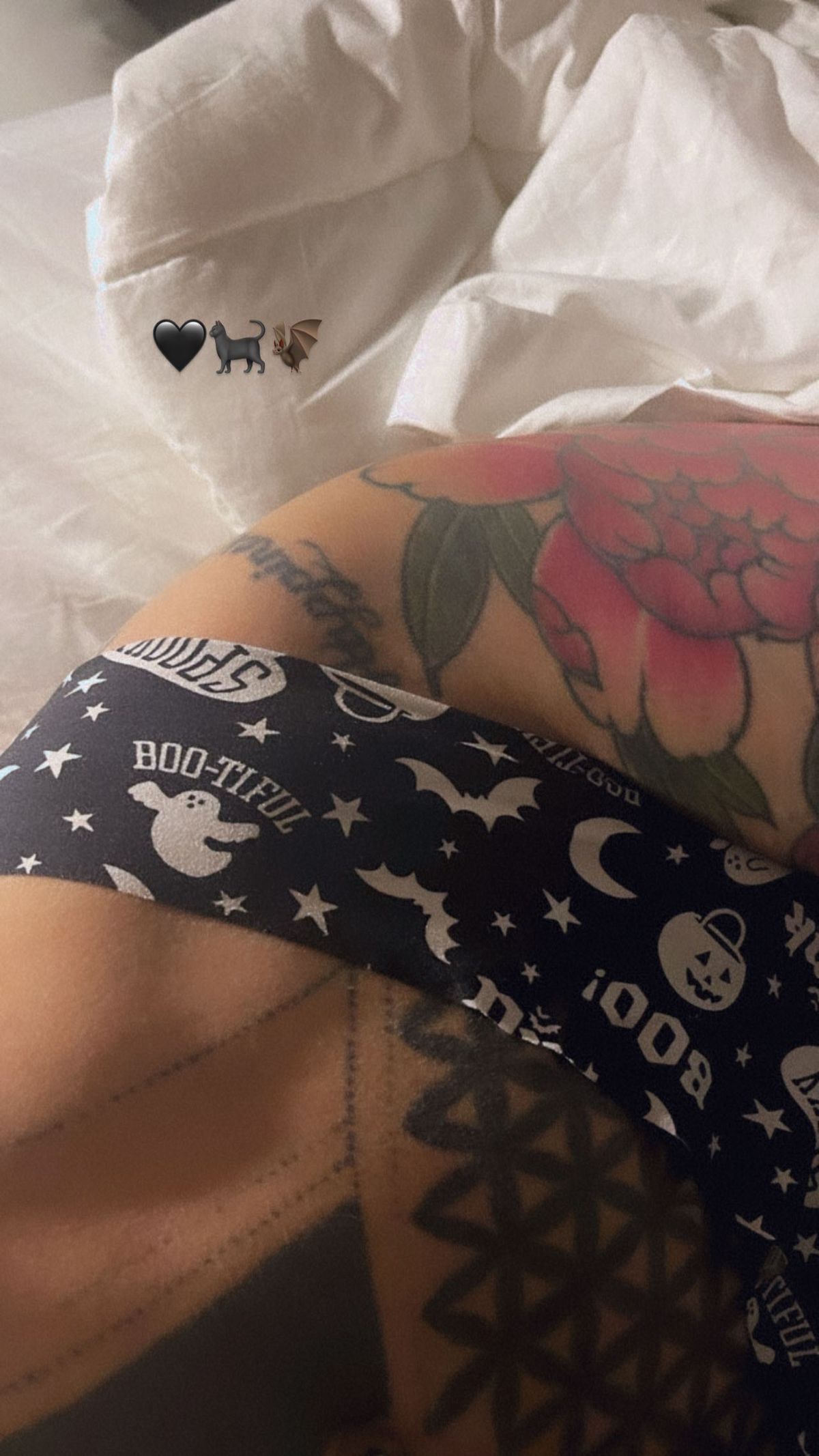 Súper atrevida, Cande Tinelli le hizo un primer plano a su culotte y dejó a la vista un estampado de fantasmas, calabazas y muerciélagos, perfecto para la celebración de Halloween.