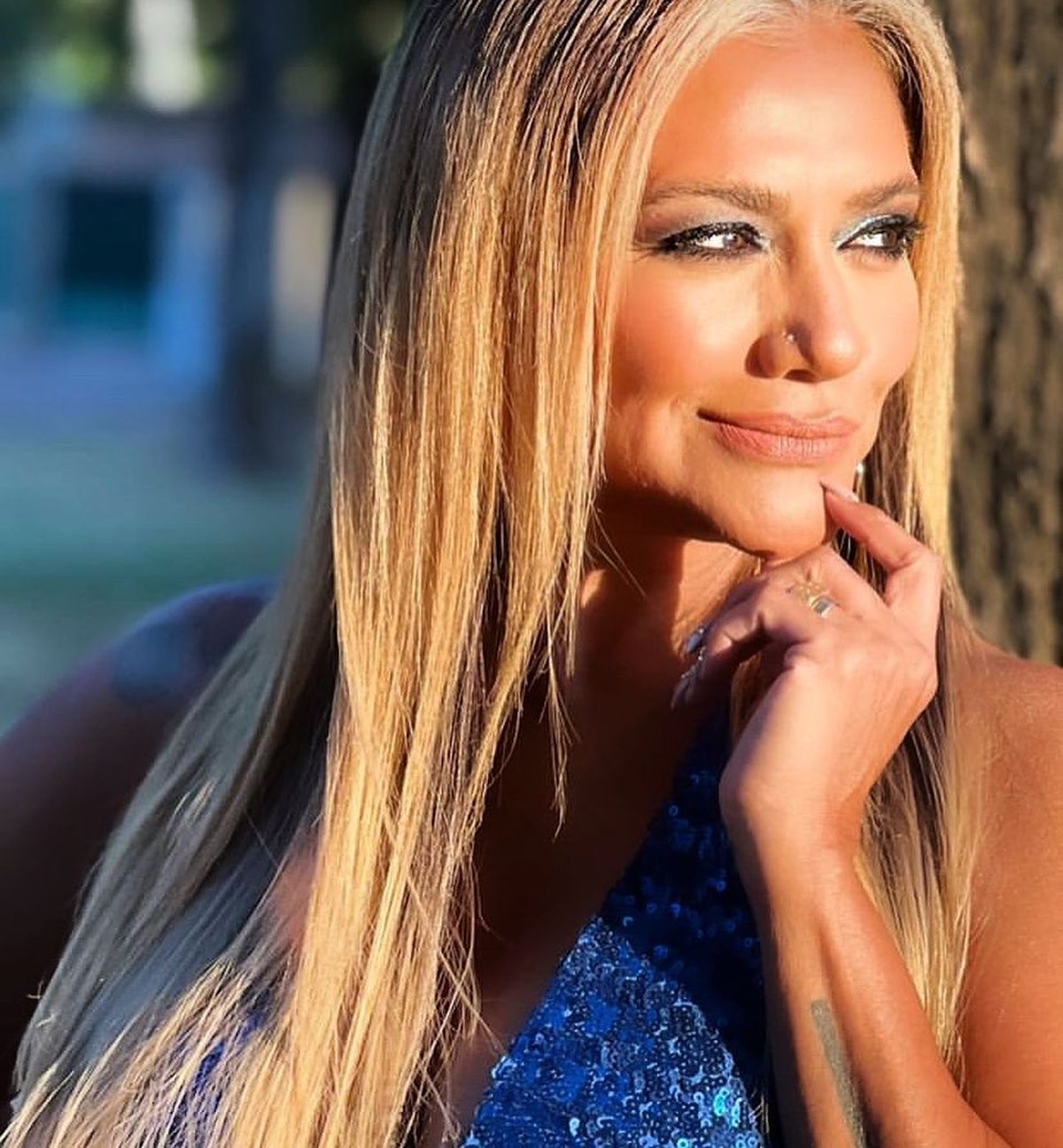 La Bomba, volvió a apostar por el color azul y posó luciendo un vestido ceñido al cuerpo aunque fue su peinado y rostro los que fascinaron a sus seguidores.