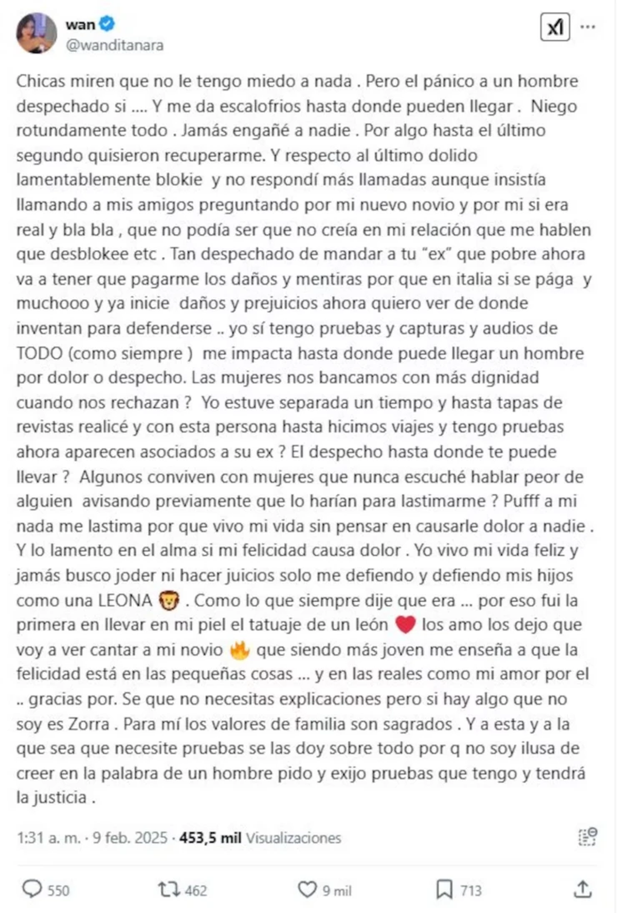 “Sé que no necesitás explicaciones, pero si hay algo que no soy es Zorra. Para mí los valores de familia son sagrados. Y a esta y a la que sea que necesite pruebas se las doy, sobre todo por que no soy ilusa de creer en la palabra de un hombre. Pido y exijo pruebas que tengo y tendrá la Justicia”, cerró la rubia.