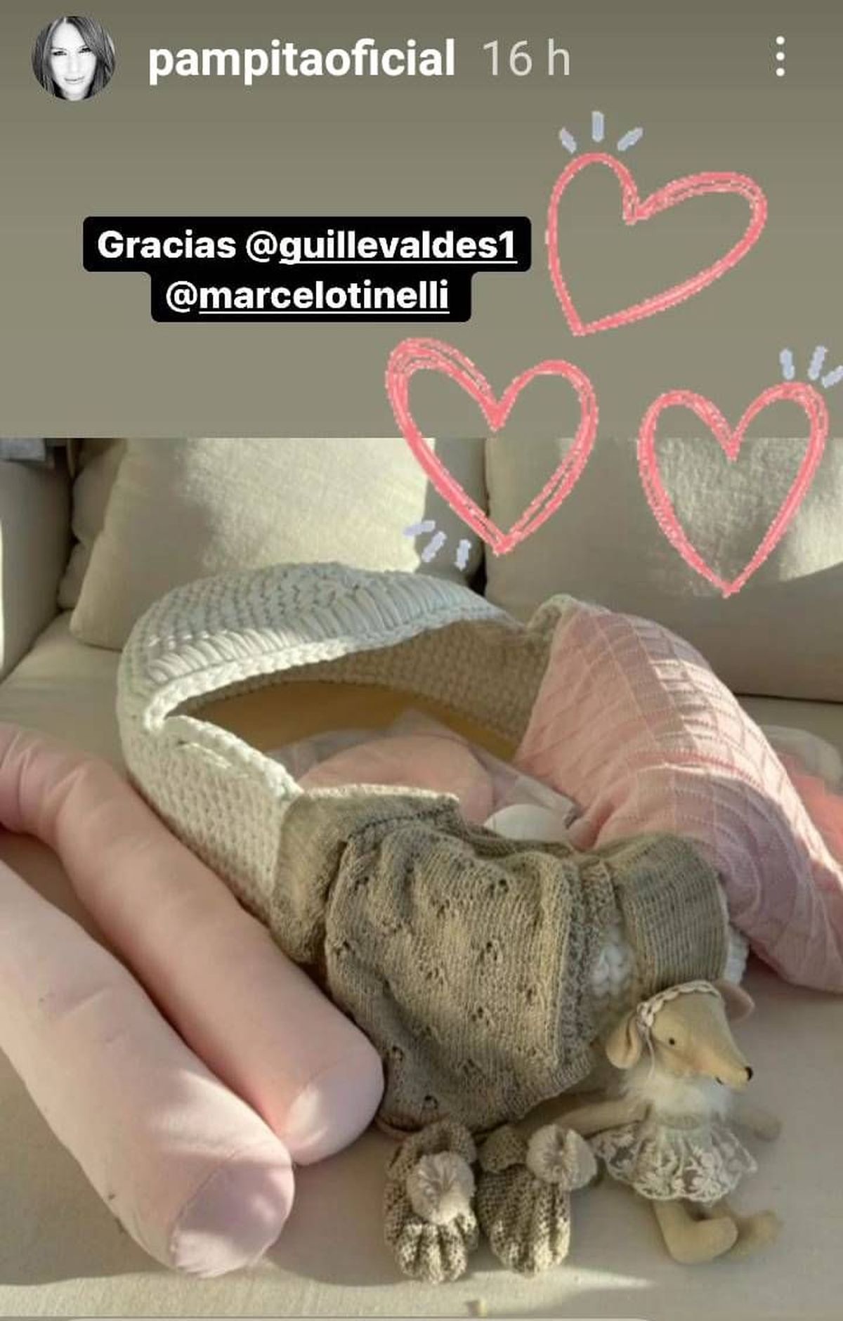 La pareja decidió enviarle a la pequeña Ana un set que comprende un moisés, almohadones, una manta, un muñeco tejido a mano y algunas prendas para la pequeña. “Gracias”, escribió Pampita en sus Instagram Stories. En la publicación, además, etiquetó a la pareja y llenó la imagen de corazones.