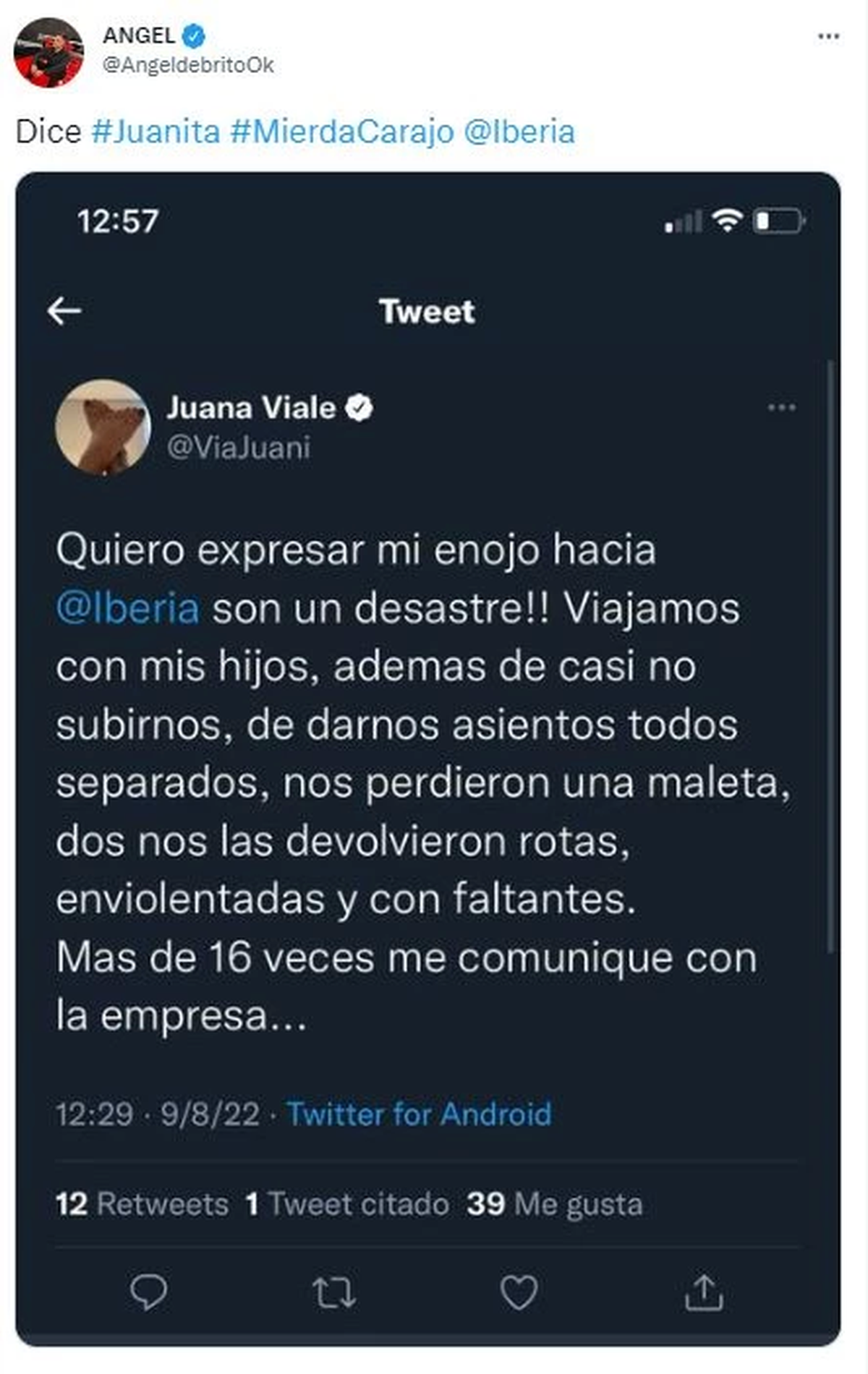 "Quiero expresar mi enojo hacia Iberia. ¡Son un desastre!”, exclamó en la red social del pajarito.