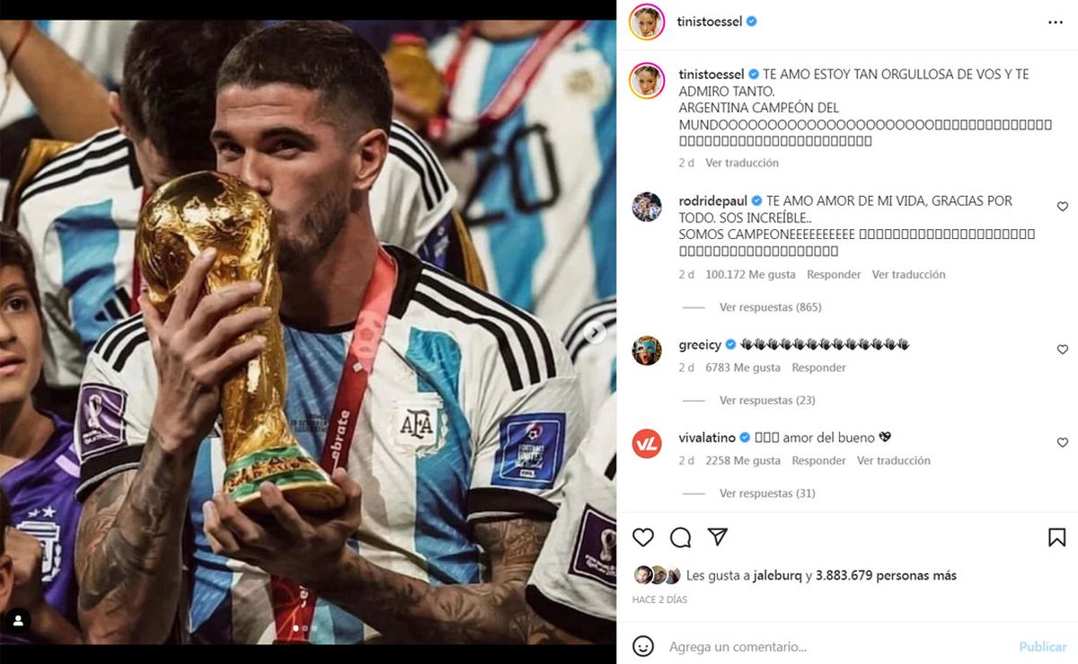 En sus redes sociales, la famosa cantante posteó en sus redes sociales: “Te amo, estoy tan orgullosa de vos y te admiro tanto. ¡Argentina campeón del mundo!”, publicó Tini Stoessel. La respuesta de Rodrigo De Paul fue inmediata: “Te amo amor de mi vida, gracias por todo, sos increíble. ¡Somos campeones!”.