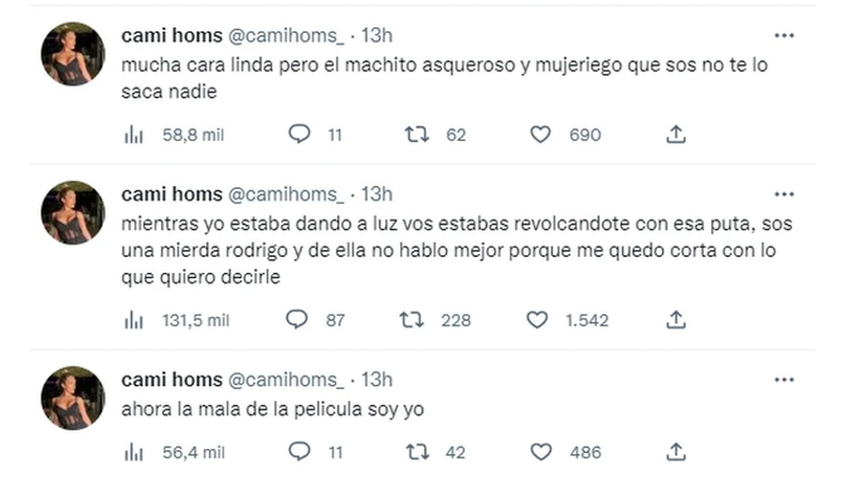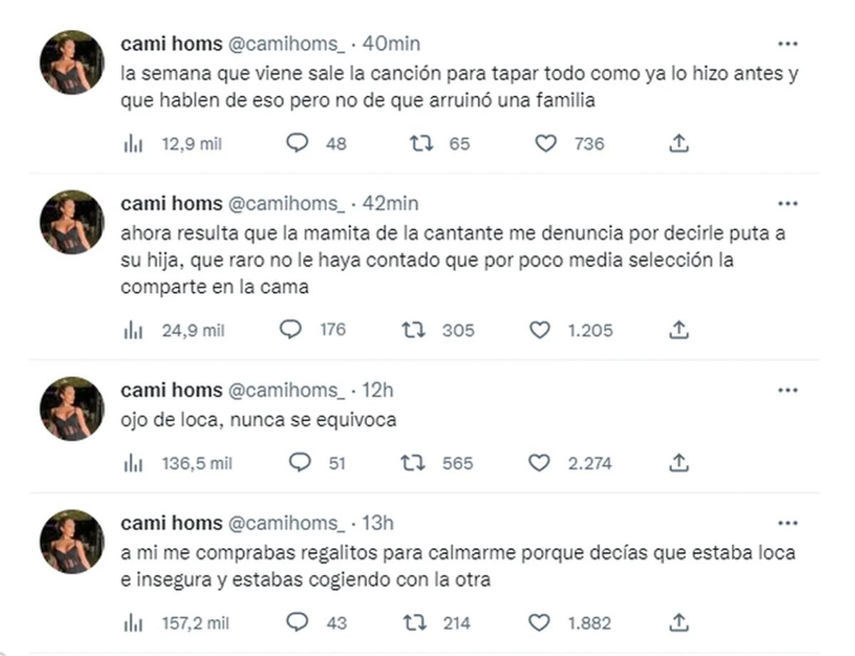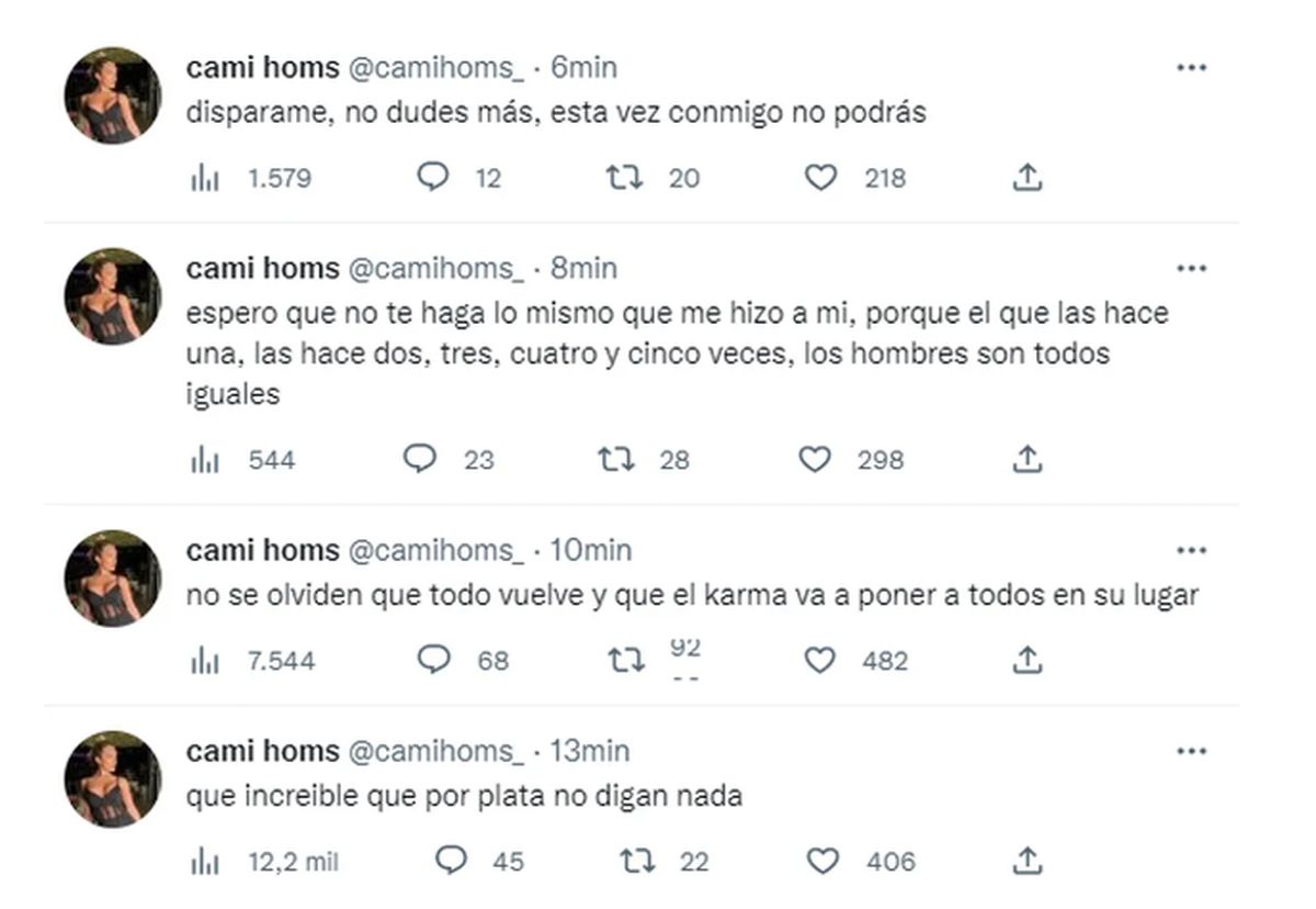 Después de esta catarata de tuits, Horacio Homs, padre de Camila aseguró al programa Intrusos que, si bien se trata de la cuenta oficial de la ex de De Paul, la misma ha sido hackeada.
