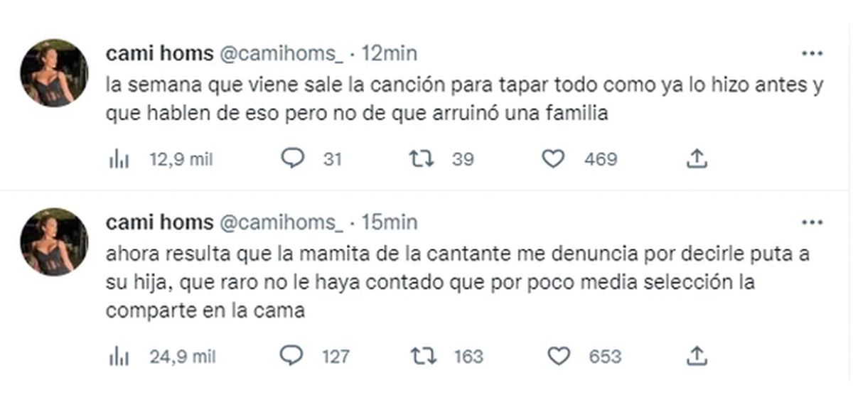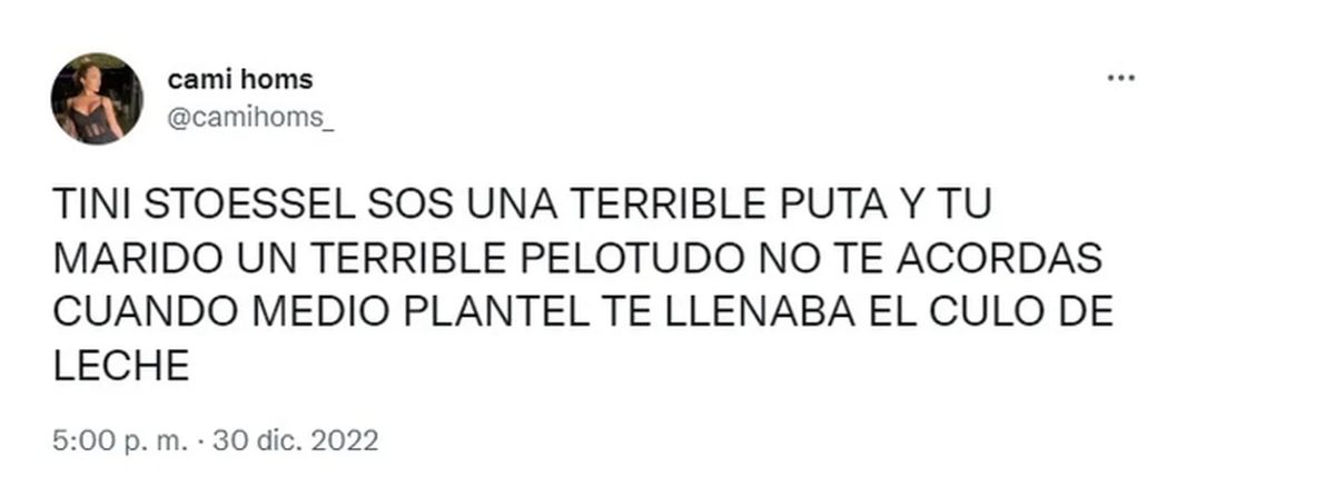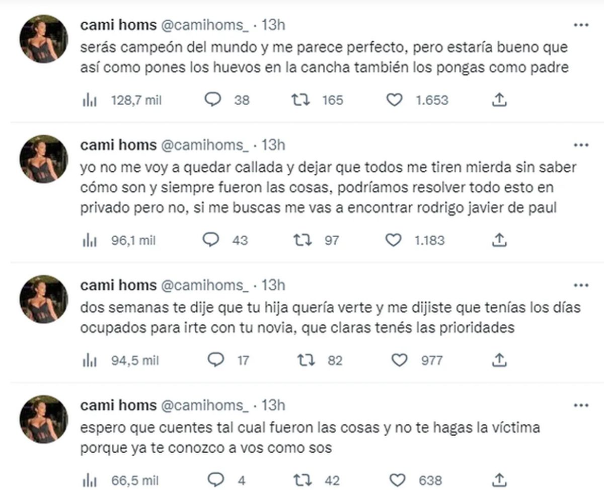 Después de que trascendieran furiosos chats entre Camila Homs y su ex marido Rodrigo De Paul, la cuenta de la modelo apareció con una metralla de tuits explosivos. Entre tanta pirotecnia verbal, los tuits acusan a Tini Stoessel de haber tenido relaciones sexuales con medio plantel de la Selección argentina.