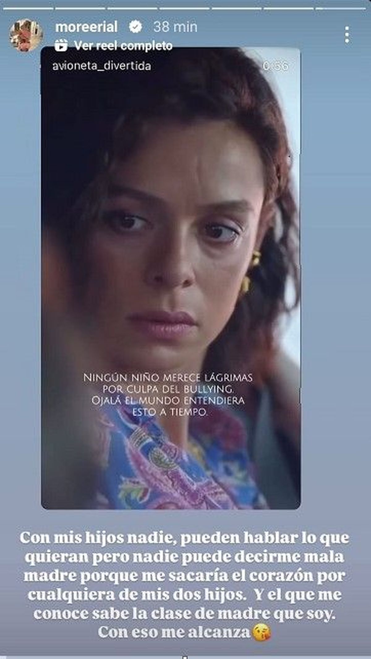 Además, Morena Rial aprovechó para contestarle a los que la criticaron como madre. "Con mis hijos nadie. Pueden hablar lo que quieran pero nadie puede decirme mala madre porque me sacaría el corazón por cualquiera de mis hijos", arrancó la hija de Jorge Rial. Morena acompañó su mensaje con un video de una madre defendiendo a su hijo víctima de bullying. "Los que me conocen saben la clase de madre que soy", cerró la joven.