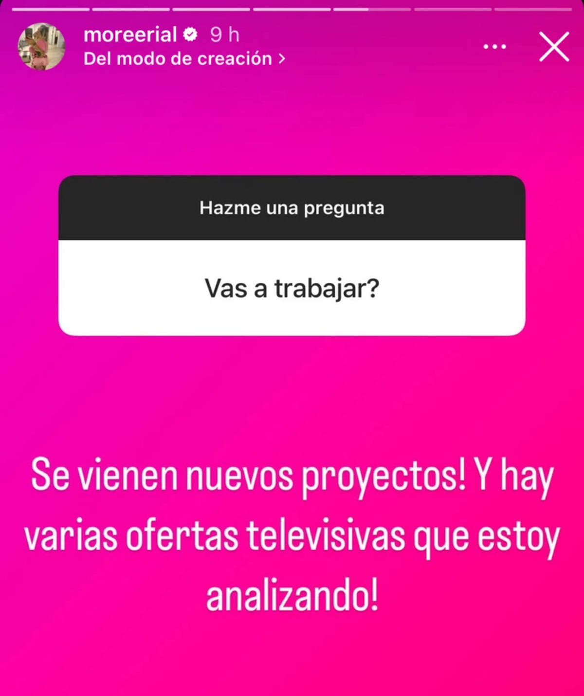 En esta oportunidad, Morena Rial se animó a contestar todas las preguntas de sus seguidores y habló de sus futuros proyectos y trabajos. "¿Vas a trabajar?", escribió un usuario a lo que Morena Rial respondió. "Se vienen nuevos proyectos. Y hay varias ofertas televisivas que estoy analizando", escribió.