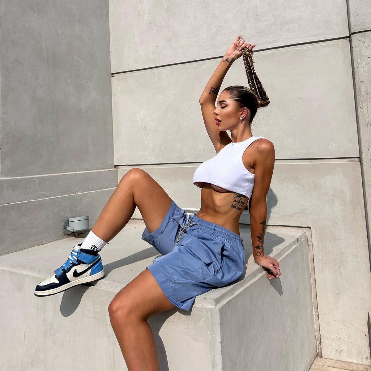 La top decidió celebrar el 8 de marzo con un álbum luciendo un look deportivo que dejó a la vista su underboob más tremendo con un crop top súper corto combinado con unas bermudas y unas zapatillas Jordan.