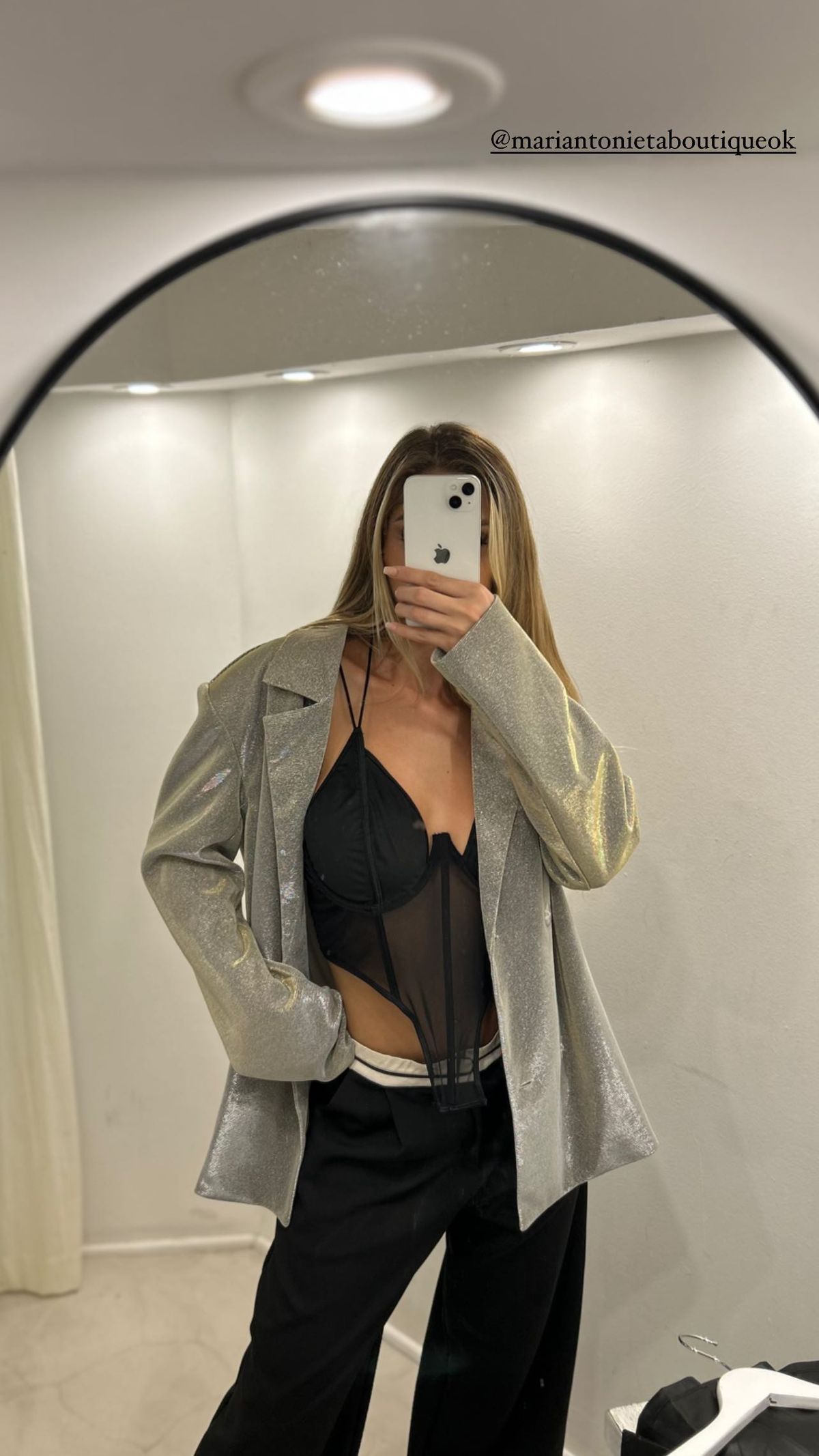 Siguiendo la tendencia del momento, Romina Malaspina llevó un body estilo corset con transparencias mega cavado y lo complementó con un jean tiro bajo y blazer plateado XL.