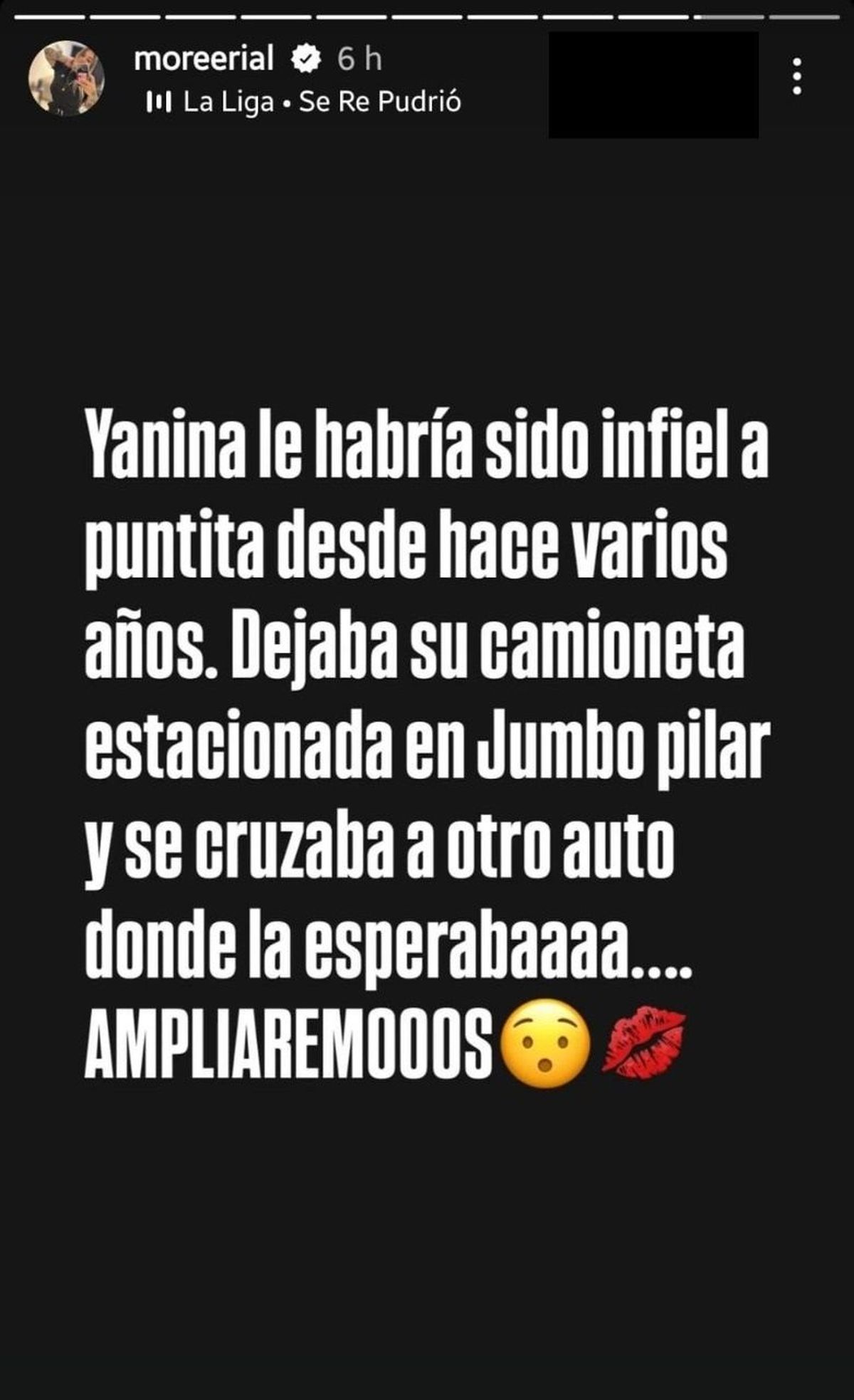 "Yanina le habría sido infiel a puntita desde hace varios años. Dejaba su camioneta estacionada en Jumbo Pilar y se cruzaba a otro auto donde la esperaba... AMPLIAREMOS", escribió Morena Rial en el posteo que paralizó las redes.