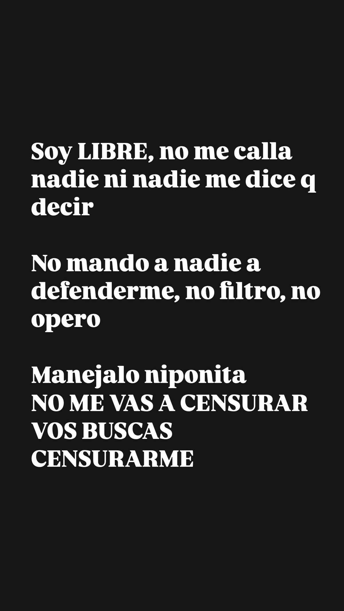 "Soy libre, no me calla nadie ni nadie me dice que decir. No mando a nadie a defenderme, no filtro no opero. Manejalo niponita no me vas a censurar, vos buscas censurarme", comenzó furiosa.