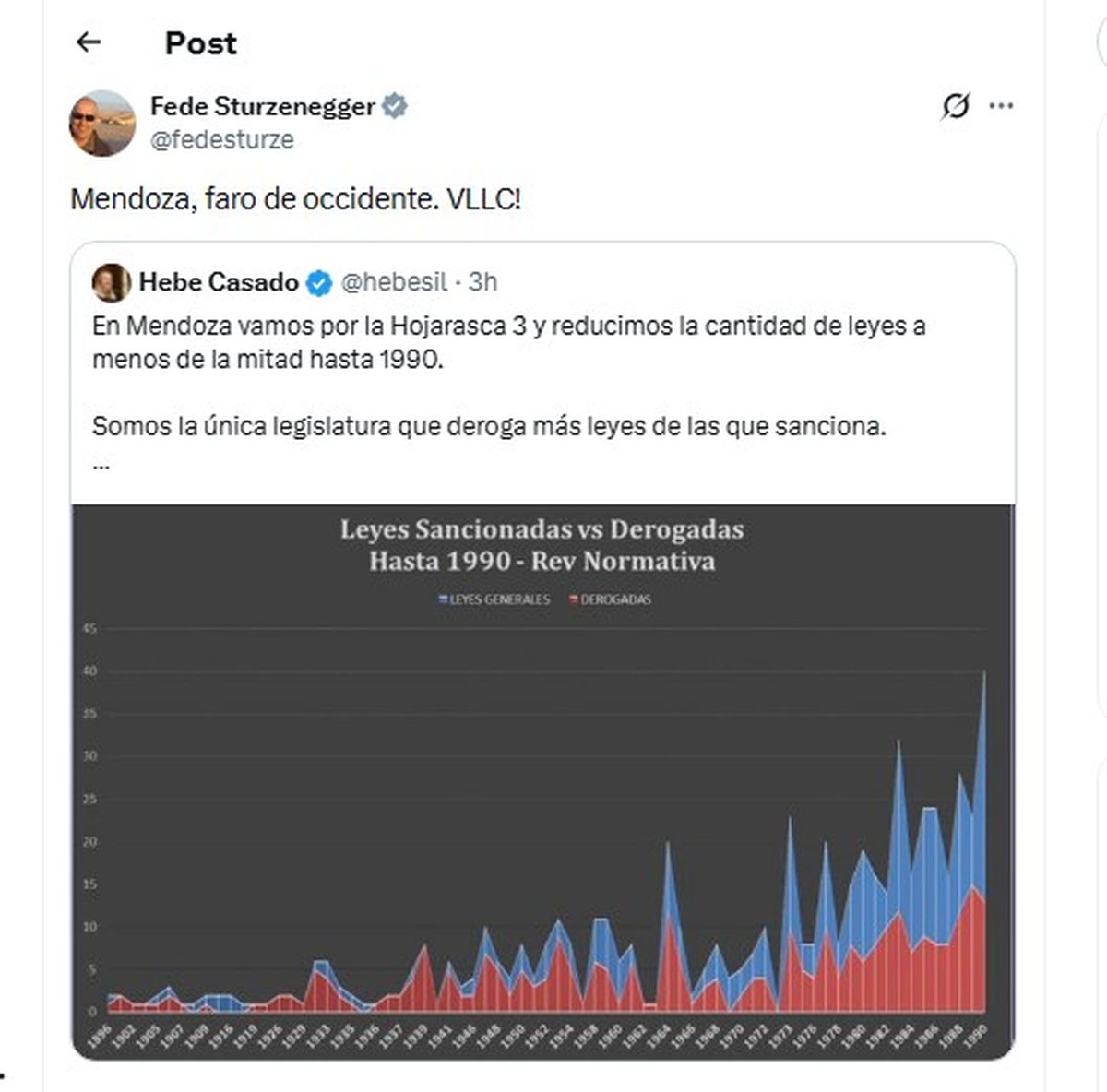 El ministro de Desregulación, Federico Sturzenegger, elogió a Mendoza por su política de depuración de las leyes viejas y en desuso y la definió como “faro de occidente”. Lo hizo al republicar un tuit de la vicegobernadora Hebe Casado, quien destacó los avances de las llamadas leyes de “hojarasca” en la provincia.