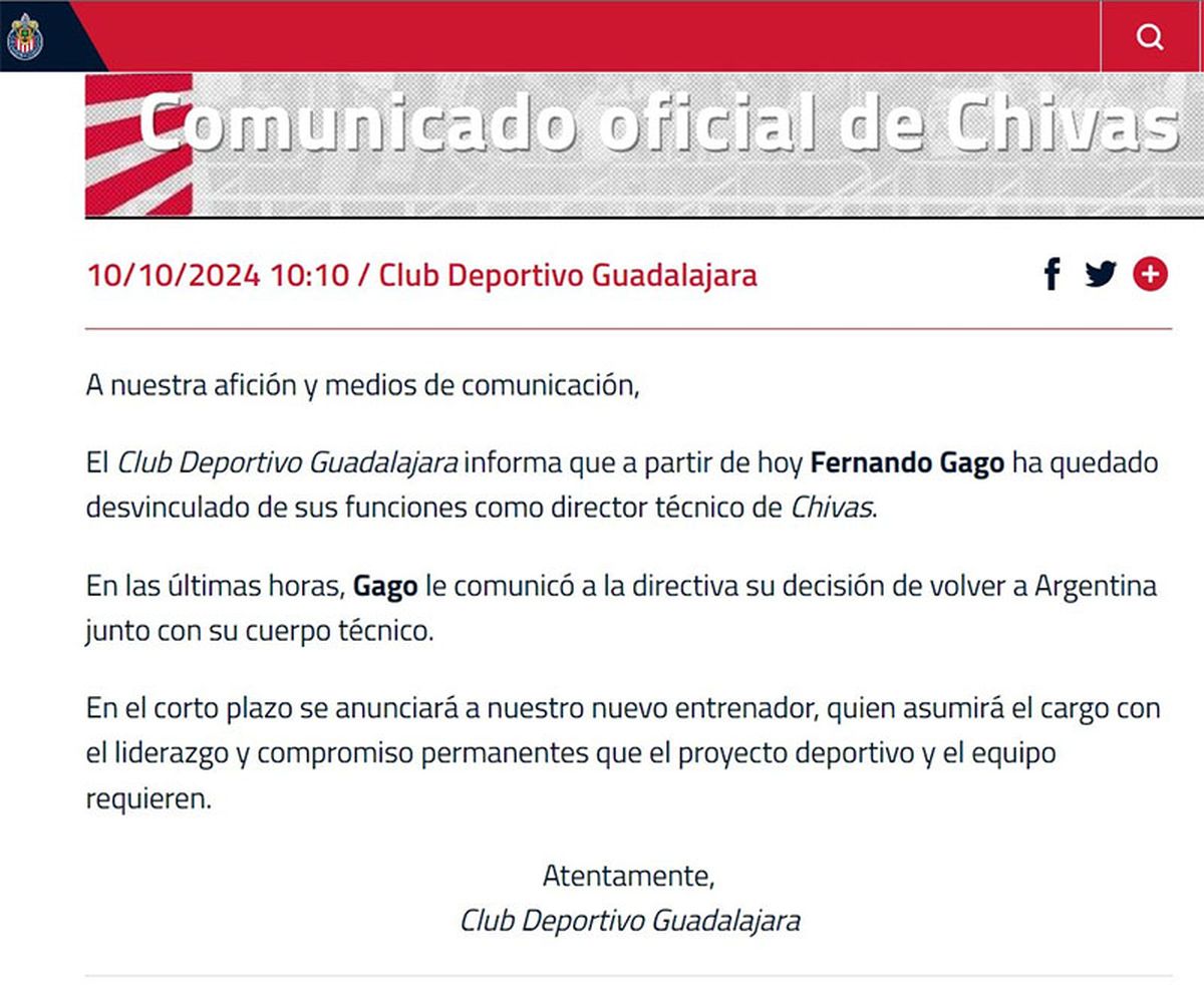 “En las últimas horas, Gago le comunicó a la directiva su decisión de volver a la Argentina junto con su cuerpo técnico”, detallaron.