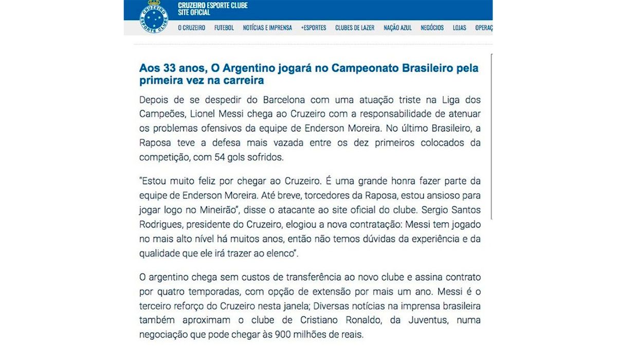 En periódico deportivo Lance señaló que la noticia de la contratación de Messi fue puesta en la web oficial de Cruzeiro, ganador de cuatro torneo brasileños y dos Copa Libertadores.