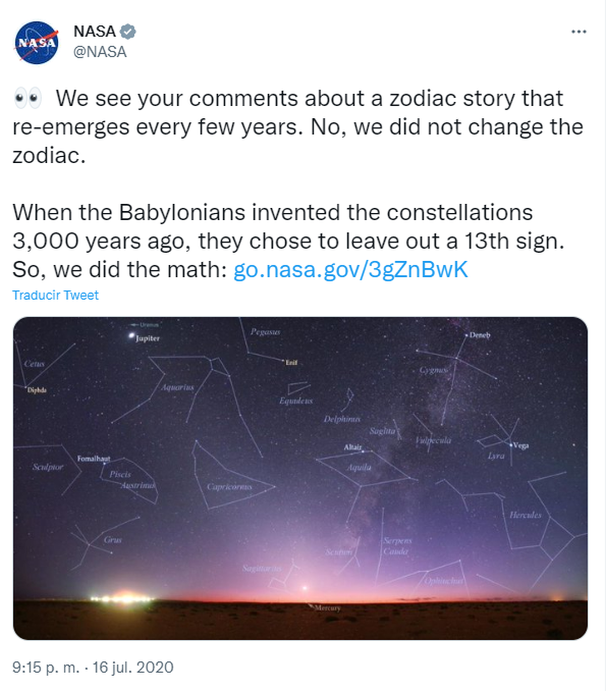 Si bien la NASA oficializó esta información en 2016, fue la astrónoma Jacqueline Mitton quien lo descubrió en 1995. En su momento aseguraba que los signos estaban adelantados y por lo tanto eran erróneos, confirmando que existía una decimotercera constelación.