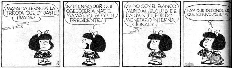 Ya en los años 60, el FMI condicionaba el progreso soberano de un país. Esa situación fue caricaturizada en la célebre Mafalda -escrita por Quino en aquellos años-, que no pierde estricta realidad. La referencia muestra a Mafalda cuando quiso ser astuta ante un pedido de su madre, diciendo que ella era Presidente y que no tenía que obedecer a nadie, y su madre, marcándole su superioridad, le respondió que ella era el FMI, para marcar la diferencia de rangos, importancias y supremacías ya reconocidas por entonces.
