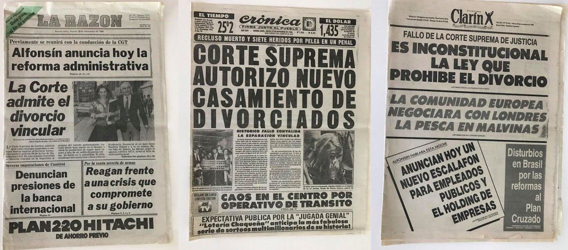 Hasta 1987 Argentina era uno de los pocos países en el mundo donde las personas divorciadas no podían volver a casarse. Fue en ese año que se sancionó la ley de divorcio vincular; sin ella, toda persona divorciada que decidiera encarar una nueva vida con la persona amada podría haber terminado tras las rejas. Suena a cuento medieval, con personas a caballo y empuñando espadas, sin embargo, esa fue la realidad de este país hace solo 31 años. Perón había sancionado una ley que contemplaba el divorcio, pero el golpe del 55 la anuló. Desde entonces las parejas no tenían más remedio que separarse de hecho y formar familias por fuera de la ley, y esa condición derivó en que existieran "hijos de primera", e "hijos de segunda", diferentes ante la ley. En agosto del 86, la Cámara de Diputados comenzó a debatir la ley. Los conservadores se opusieron, la Iglesia Católica operaba para que no se aprobara, también se organizaban marchas vaticinando la destrucción de la familia e incluso las escuelas sacaron a sus alumnos a la calle con globos y banderas argentinas para presionar y lograr que se frenase lo que consideraban "el fin de la familia".