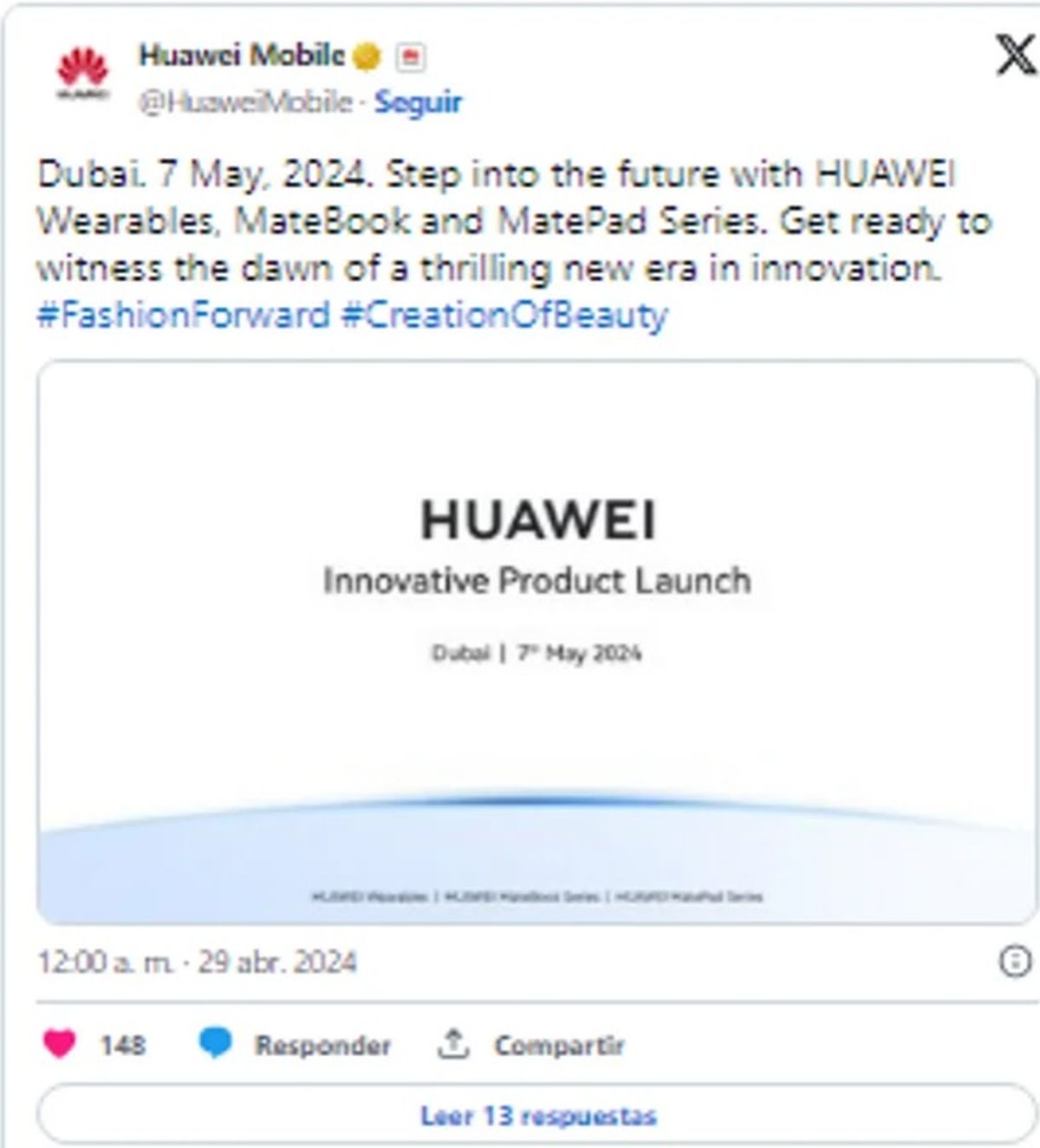 Tal y como publicaban los compañeros de GSMArena, ya es oficial que el fabricante chino saldrá a la palestra en Dubai el próximo martes 7 de mayo para hablar de "productos innovadores", mencionando ya de forma directa nuevos wearables y a las familias MatePad y MateBook.