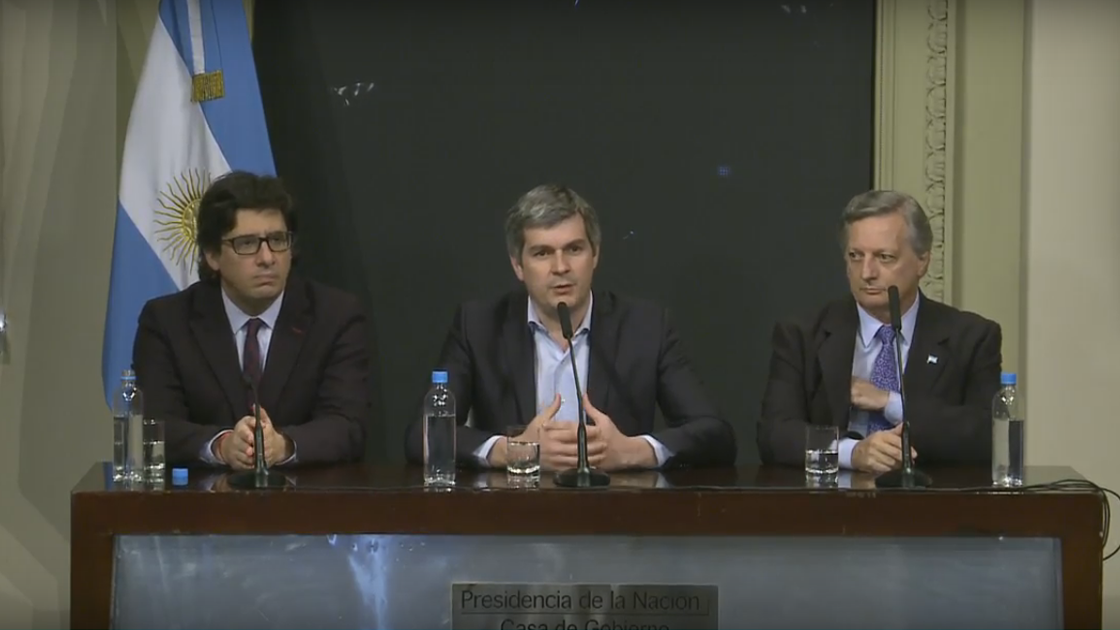El jefe de Gabinete, Marcos Peña, y los ministros de Energía y Minería, Juan José Aranguren, y de Justicia, Germán Garavano, brindaron una conferencia de prensa en Casa de Gobierno en la que dan a conocer la posición oficial frente a la decisión judicial que frenó el aumento de tarifas en el servicio de gas.