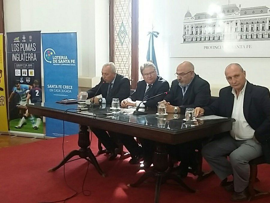 En el salón blanco de Casa de Gobierno, en la ciudad de Santa Fe, se presentó en la mañana de este martes, el test match de la ventana de junio que sostendrán Los Pumas con Inglaterra, el sábado 17 de junio, en el estadio Brigadier López del Club Atlético Colón. La reunión con la prensa fue encabezada por el presidente de la UAR, Carlos Araujo; el presidente de la USR, Jorge Bruzzone; el vicepresidente de la Unión de Rugby de Rosario, Javier Escalante, y el contador Carlos Fascendini, vicegobernador de la provincia de Santa Fe. También se hicieron presentes, el integrante del concejo directivo de la UAR, Julio Clement; el vicepresidente de la USR, Esteban Fainberg; los presidentes de los clubes, Ricardo Baragiola, (Santa Fe RC), Alberto Pelossi (Universitario), Alejandro Molinas (CRAI), Norberto Carosso (Cha Roga); Álvaro Gaviola, vicepresidente ejecutivo de la Lotería de Santa Fe; Carlos Iparreguirre, secretario de deportes de la provincia de Santa Fe; el ministro de gobierno, Pablo Farías; y el vicepresidente de Colón, Horacio Darrás.La conferencia sirvió para confirmar que este miércoles 28 de marzo se pondrá en marcha la venta de entradas. Las mismas se pueden adquirir a travéz de ticketek.com.ar en todo el país; los clubes, en el ámbito de la USR, y en Triferto Peatonal, ubicado en San Martín y Falucho. El presidente de la USR, Jorge Bruzzone, comentó que "la ciudad de Santa Fe tendrá nuevamente la satisfacción de recibir a Los Pumas, y en esta ocasión ante un rival de una gran jerarquía como lo es Inglaterra. Se trata de uno de los mejores equipos del mundo, por lo tanto estamos ante un evento muy dificil de repetir. Con lo cual estamos muy satisfechos y conformes en haber podido conseguir que Los Pumas jueguen en Colón".El rosarino Carlos Araujo, presidente de la Unión Argentina de Rugby, explicó que "quería agradecer al gobierno provincial por el apoyo que nos dieron desde el primer momento, porque sin su colaboración no se pueden organizar este tipo de eventos. Es una satisfacción muy grande poder venir con nuestros Pumas a Santa Fe, ya que es la base de la cual se sustenta todo el rugby argentino. Venir a las provincias con el seleccionado marca a las claras como la UAR toma en serio su conformación federal. Llevamos nuestros jugadores a todos los puntos del país, porque en junio, Los Pumas irán a Jujuy y San Juan, y ese es el objetivo que tenemos"."Vengo a transmitir el saludo del señor gobernador Miguel Lifschitz, ya que para la provincia de Santa Fe, es muy importante contar con este test match, ya que el deporte es clave en esta gestión. Será un evento de jerarquía internacional, que muestran a la ciudad y a la provincia en una dimensión importante, y en un estadio como el de Colón, que cuenta con todas las comodidades para poder llevarlo a cabo", señaló el vicegobernador Carlos Fascendini.