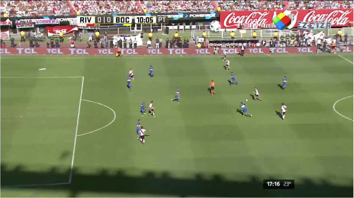 River y Boca igualaron 0-0 en el Monumental, en un partido intenso que tuvo al equipo de Marcelo Gallardo como protagonistas y que tuvo las chances más claras de gol Fue un primer tiempo entretenido. Diferente a las últimas versiones, donde el juego brusco se imponía por sobre las ideas. En este marco, fue River el que tuvo las mejores chances. Aprovechó la banda izquierda con Vangioni (la figura en los 45m) y Driussi para llevar con peligro al arco de Orión. Mercado lo tuvo luego de una pelota parada. Ponzio no pudo conectar bien una habilitación del juvenil Driussi. Mora se perdió un gol increíble al estrellar en el palo tras un centro del juvenil. Boca estuvo apagado. El mediocampo no tuvo contención ni agresividad a la hora de atacar. Apenas un remate de larga distancia de Palacios y otro de Tévez fueros las cartas que mostró el equipo de Guillermo.