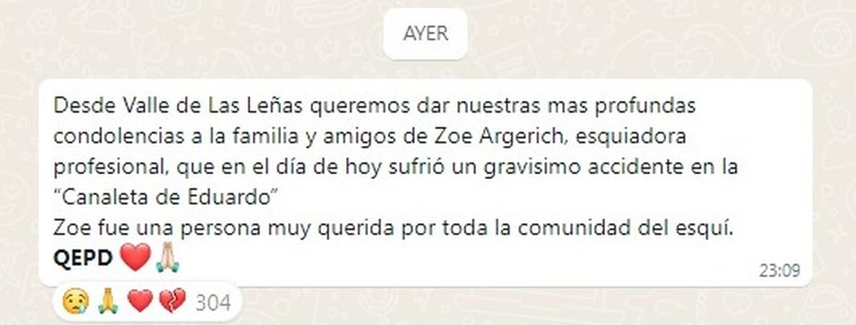 La muerte de la joven Zoe Argerich, quien era experta en esquí y encontró su final este martes al intentar transitar un fuera de pista en Las Leñas, generó muchas repercusiones en el ambiente. Un colega de Zoe aseguró que la chica de 24 años "era súper precavida, una atleta increíble", mientras que el centro turístico emitió sus condolencias tras la triste noticia.
