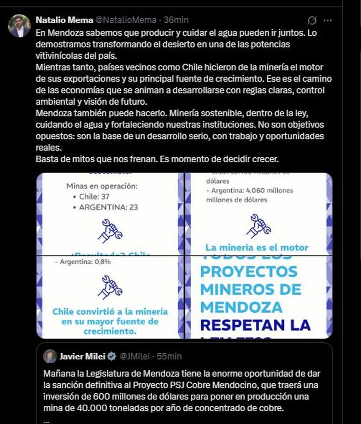 Milei utilizó sus redes sociales para dar a a conocer su postura y explicar los beneficios que puede traer a Mendoza el desarrollo de la explotación de cobre en Uspallata.