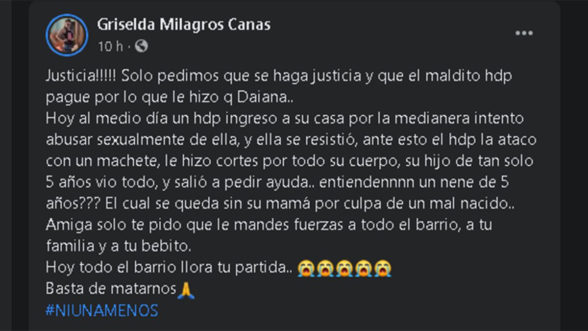 Pasadas las 14, Daiana fue atacada por un hombre que la violó mientras la hirió con un machete en casi todo su cuerpo. Todo ese aberrante hecho ocurrió frente los ojos de su pequeño hijo.