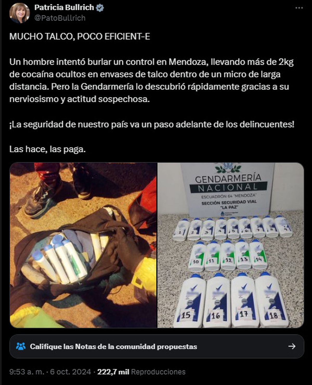 Gendarmería lo detuvo en La Paz y el narcotest dio positivo de drogas. Hasta Patricia Bullrich festejó en la red X. El análisis final reveló que, como decían los 18 envases, era talco