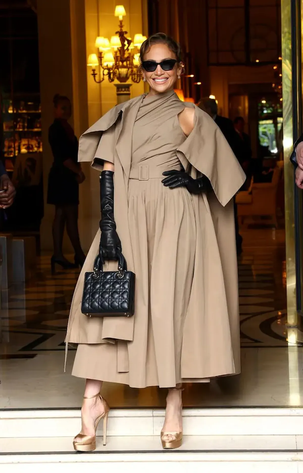 Jennifer Lopez llegó al desfile de Dior con vestido que simulaba ser un abrigo y con cinturón coordinado. Lo complemento con guantes de cuero muy largos y peep toes, fiel al estilo de JLo, con plataforma.