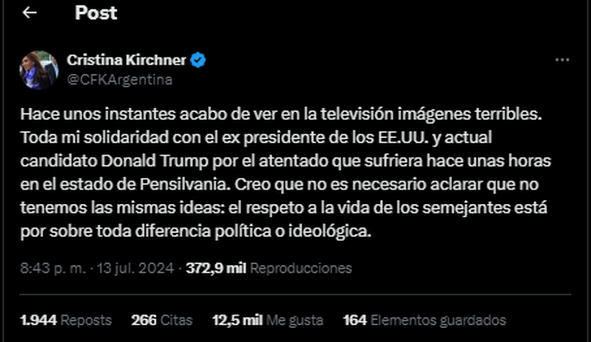 "Hace unos instantes acabo de ver en la televisión imágenes terribles. Toda mi solidaridad con el ex presidente de los EE.UU. y actual candidato Donald Trump por el atentado que sufriera hace unas horas en el estado de Pensilvania", expresó CFK en redes sociales.