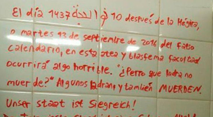 La Policía Federal inspeccionó en la mañana de este martes las instalaciones de la facultad de Ciencias Exactas de la Universidad de Buenos Aires, a propósito de una inscripción encontrada en un baño el pasado 8 de agosto, donde se anunciaba que "el martes 13 de septiembre ocurrirá algo horrible en esta atea y blasfema facultad", junto a un dibujo de la bandera del Estado Islámico. El grafitti, pintado en la pared de un baño, incluye mensajes en español, francés, alemán, ruso y árabe, e incluye leyendas como "nuestro Estado será victorioso" y "el Estado Islámico es un regalo de Alá".