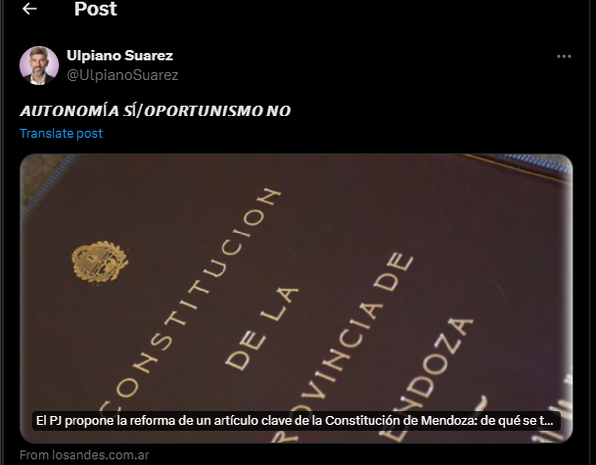 El intendente radical de la Ciudad, Ulpiano Suarez, dejó asentada su postura al respecto de la reforma que propuso el PJ y así lo manifestó en su perfil de la red social X.