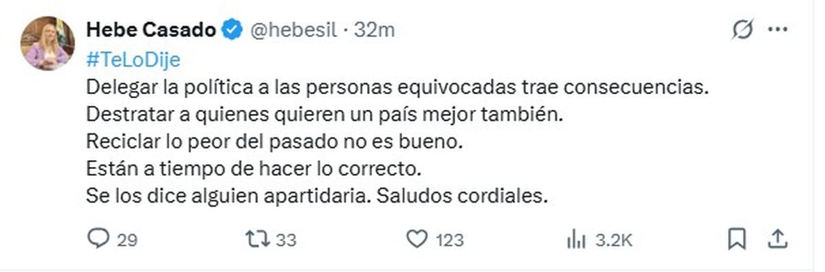 La vicegobernadora Hebe Casado publicó un duro tuit sobre los resultados de la derrota del gobierno nacional en las elecciones de la provincia de Buenos Aires. Luego, en diálogo con Nihuil, responsabilizó directamente a Lule Menem por lo ocurrido y pidió que el gobierno nacional dé un "volantazo" urgente antes de octubre.