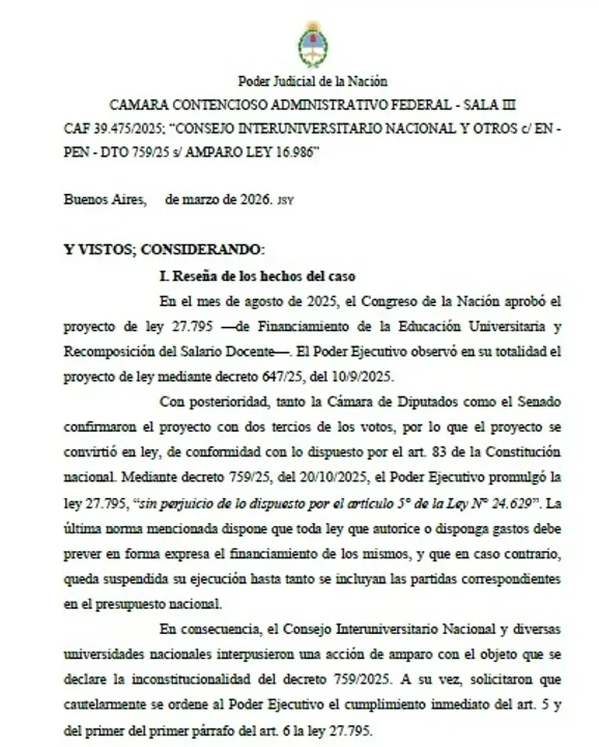 "La educación universitaria es un servicio público esencial y su desfinanciamiento pone en riesgo derechos constitucionales básicos", destaca uno de los párrafos más fuertes de la resolución.