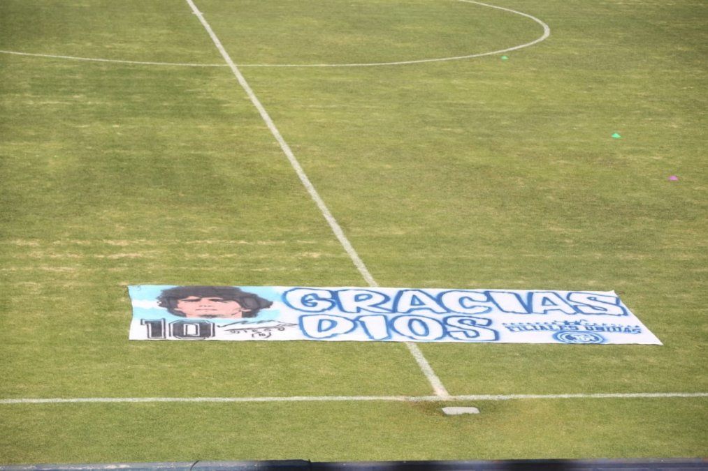 Dentro del campo de juego se tendió un trapo de con la cara de Diego Maradona y la frase "Gracias Dios".