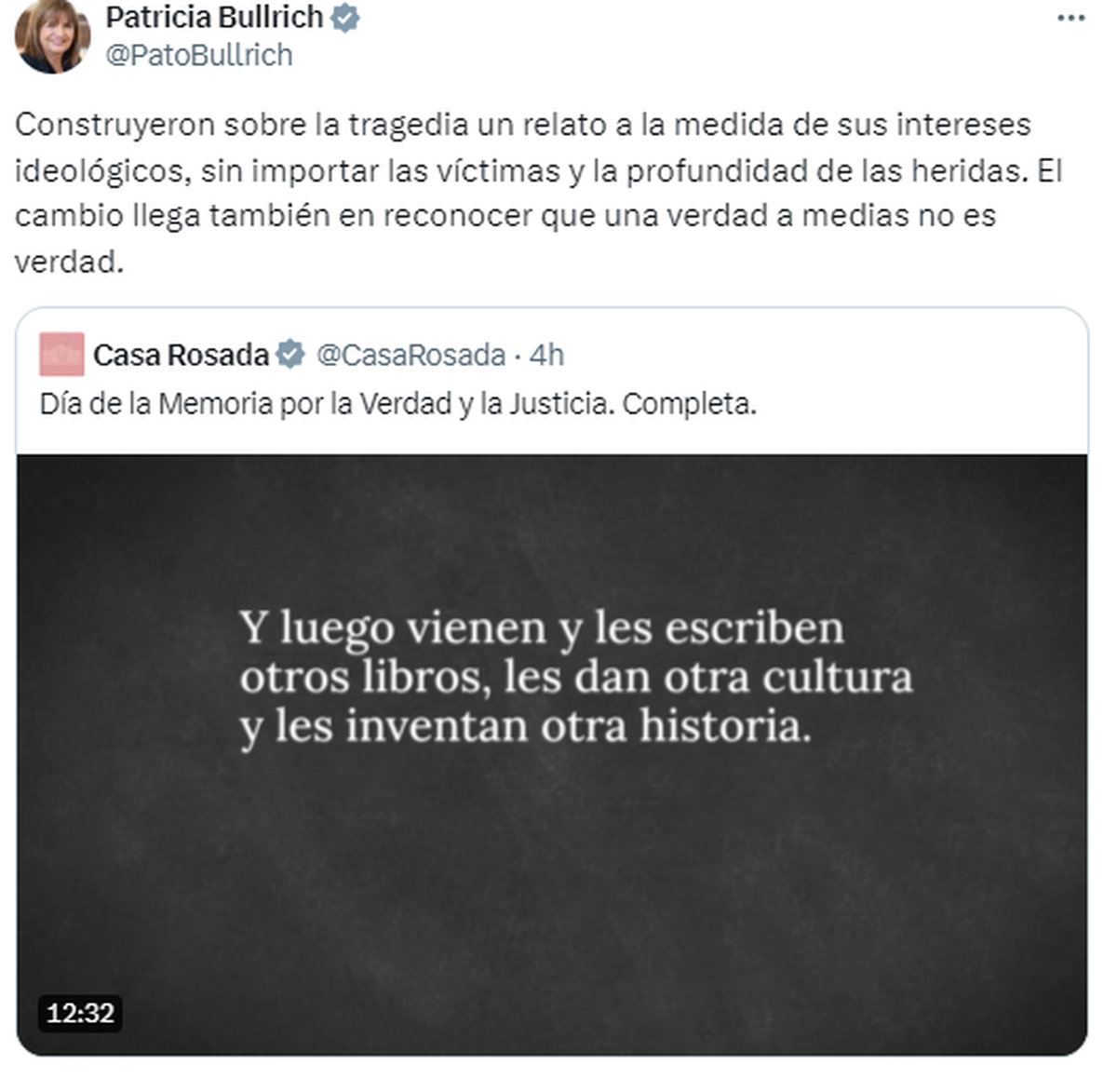 La ministra de Seguridad, Patricia Bullrich, compartió en sus redes sociales en video que publicó la Casa Rosada y sostuvo: "Construyeron sobre la tragedia un relato a la medida de sus intereses ideológicos, sin importar las víctimas y la profundidad de las heridas. El cambio llega también en reconocer que una verdad a medias no es verdad".