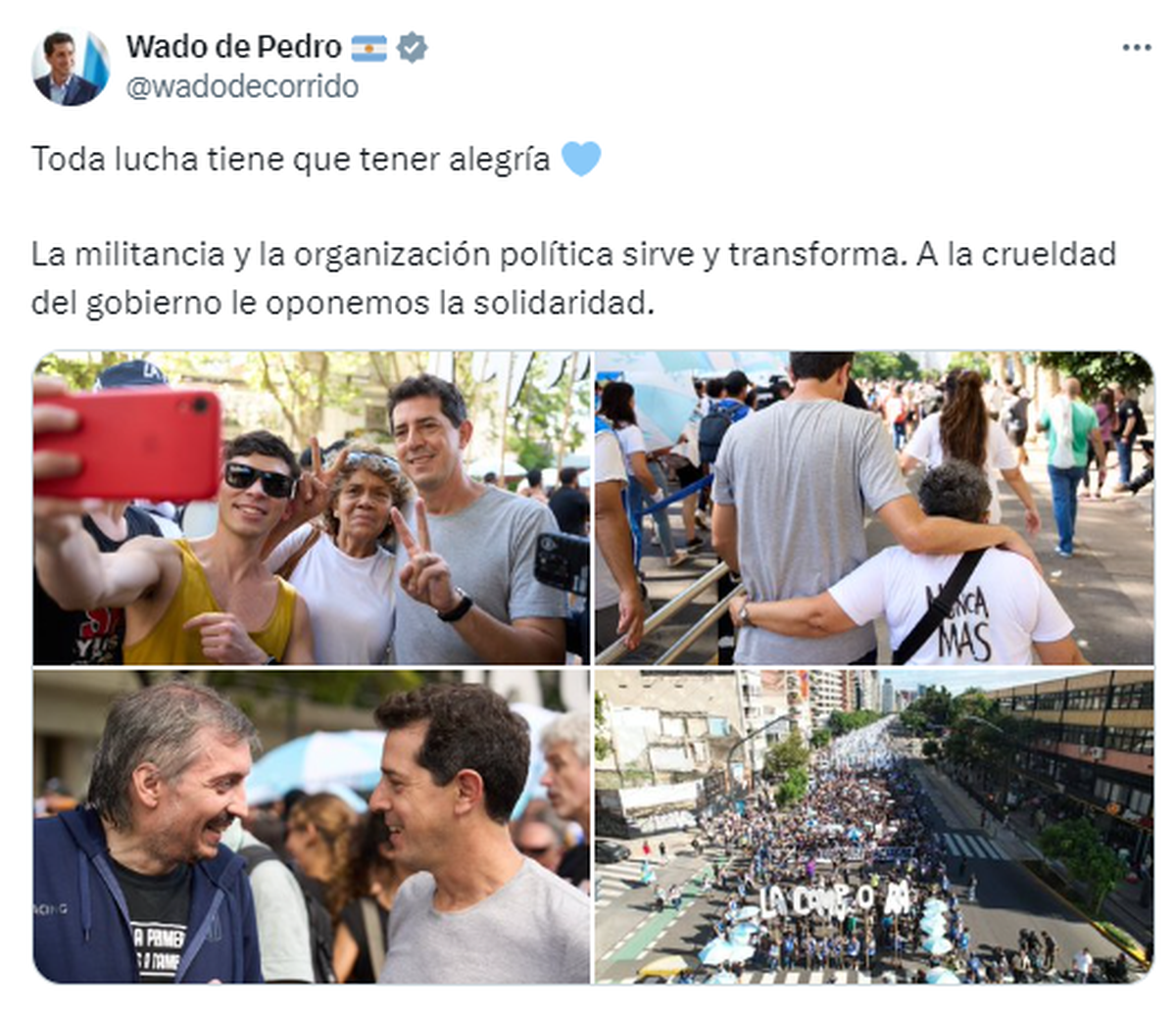 Eduardo “Wado” de Pedro se hizo presente en la marcha de La Cámpora por el 24 de marzo y cuestionó el video oficial que el Gobierno compartió a través de las redes sociales de la Casa Rosada. "Toda lucha tiene que tener alegría La militancia y la organización política sirve y transforma. A la crueldad del gobierno le oponemos la solidaridad", señaló.