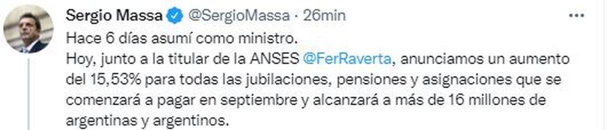 La medida fue anticipada el miércoles pasado por el propio Massa cuando asumió la cartera de Economía. En esa oportunidad, el ministro aseguró que "se va a anunciar el índice de movilidad jubilatoria con un refuerzo que ayude a los jubilados para superar el daño que les produce la inflación".