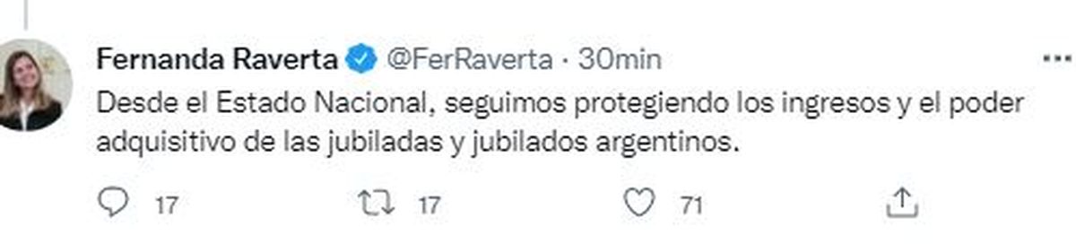 "Además, con este nuevo aumento del 15,53% por la Ley de Movilidad mejoramos las asignaciones familiares, llevando la Asignación Universal por Hijo y la Asignación por Embarazo a $8.471. Desde el Estado Nacional estamos dando un paso más para proteger a los jubilados y jubiladas. Con esta medida acompañamos a quienes más lo necesitan y lo hacemos manteniendo el orden en las cuentas por el incremento de recaudación que representa el adelanto de Ganancias", indicó el superministro.
