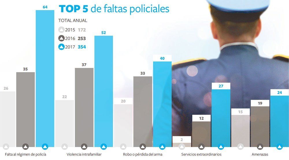 Otras de las causas que inciden en las sanciones de los efectivos es la recurrente pérdida del arma reglamentaria que les otorga el Estado para trabajar. Esta situación, que el año pasado fue reglamentada de manera tal que el efectivo que perdiere su pistola 9 milímetros debe pagarla, buscó hacer descender esta histórica estadística, también bajo la presunción de que había efectivos que alquilaban sus armas.