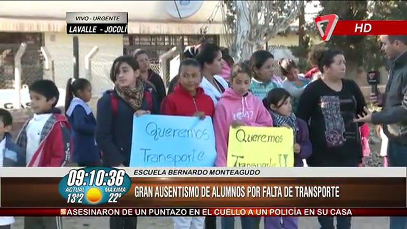 Los chicos deberían estar sentados en el aula, mirando y aprendiendo con su docente pero no. Están con sus padres a la vera de la ruta 40 en Jocolí reclamando por la falta de transporte escolar. Ese que no aparece desde hace dos semanas y por lo que no pueden ir a clases.Son alumnos del distrito de Lavalle, que viven en alejados parajes rurales y necesitan de los micros que contrata la Dirección General de Escuelas para asistir a la escuela 1- 373 Bernardo de Monteagudo en Jocolí.La madre de uno de ellos, pidió ante las cámaras de Canal 7 que la DGE intervenga de inmediato para que los chicos pueden ir a clases "como cualquier alumno de Ciudad. Queremos para ellos las mismas condiciones que tienen todos los chicos".En la manifestación los mismos chicos portaron carteles con la leyenda: Queremos transporte. Se juntaron decenas de padres y de alumnos para darle visibilidad a un reclamo silencioso cuya falta de cumplimiento los deja en desventaja para el futuro.Desde la DGE acusaron recibo de la protesta y voceros oficiosos dijeron que están trabajando en el tema, aunque no dieron un plazo preciso para corregirlo y garantizarle a los alumnos la prestación de un micro que los lleve a la escuela.Luego de la concentración, padres y alumnos cortaron una mano de la la ruta 40, la que va a San Juan, a la altura del km 3344 para reafirmar su reclamo.