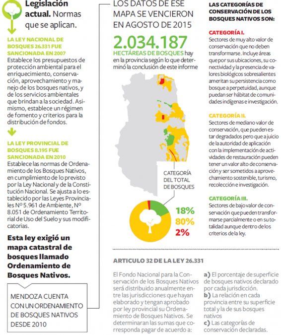Mendoza sancionó en 2010 la Ley Provincial de Bosques N° 8.195 y elaboró un anexo con este mapa catastral de bosques que exige la Nación para garantizar el subsidio. La reglamentación establece que el Ordenamiento sea actualizado cada 5 años y por lo tanto el 2015 debería haber sido remplazado por un nuevo estudio. Sin embargo, la gestión anterior ni la actual pudo aún hacerlo.