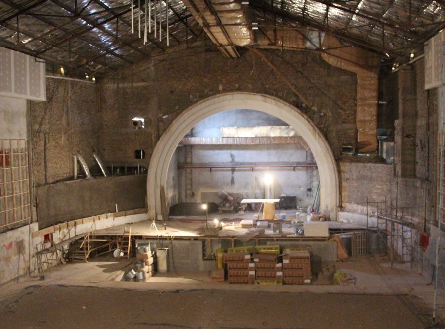 En la otra sala, la principal, destinada al teatro ya se puede observar el avance en el cielo raso de paneles acústicos que van cubriendo el sistema de climatización ya instalado.