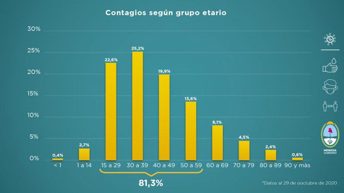 De los datos oficiales también surge que en la franja etaria de los 15 a los 59 años, es donde más contagios se producen y también donde se da el mayor porcentaje de recuperación. Sigue manteniéndose en el 81,4% de los infectados.