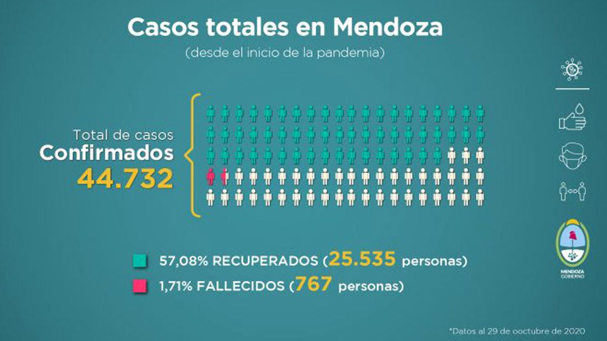 Los primeros datos que se desprenden desde que comenzó la pandemia en Mendoza son: 39.478 confirmados, 22.236 recuperados y 650 fallecidos.